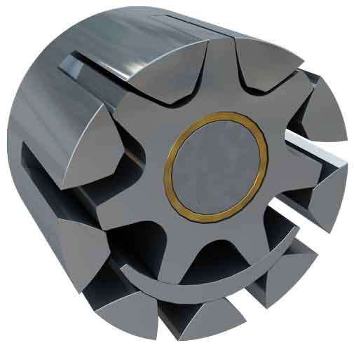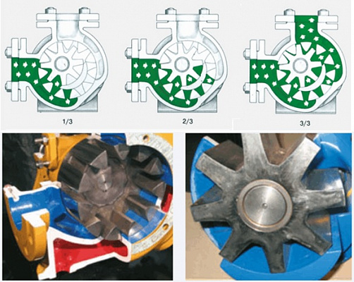 Основные рабочие элементы насоса — ротор и ведомая шестерня, установленные одна в другую и разделенные серповидным элементом, вращение которых вызывает перемещение объемов. Всасывание раствора создается разъединением зубцов, а подача — их соединением.